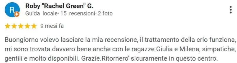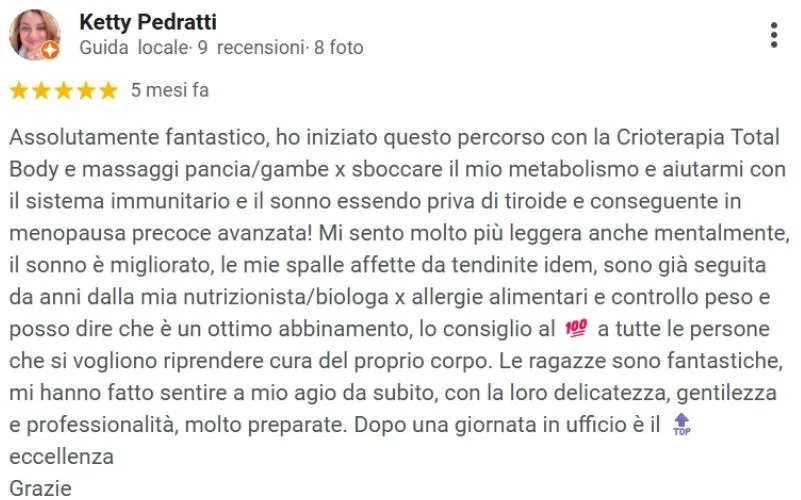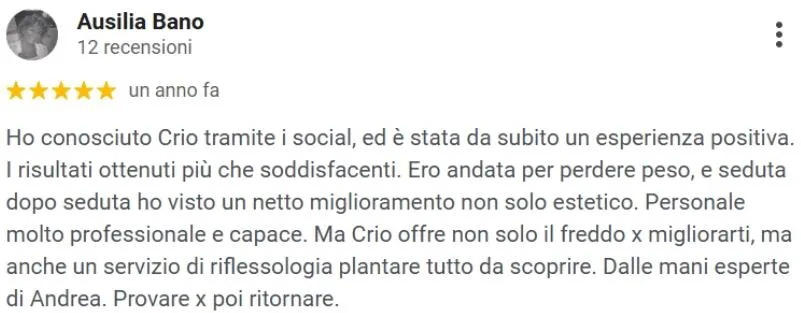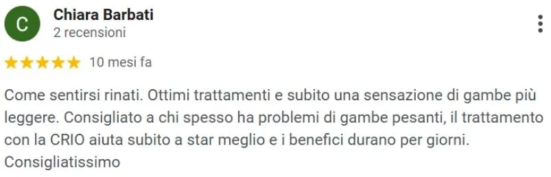 “Consigliato a chi spesso ha problemi di gambe pesanti, il trattamento con la CRIO aiuta subito a star meglio e i benefici durano per giorni”
